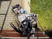 Picked up my R1 engine this lunchtime and made sure all the things on my check list were present. It's a 2800 mile 2003 engine from a write-off R1. The engine looks very clean and as new, apart from some scuffing the the alternator case, where it must have slid along the road. Also got a huge box of bits including the airbox, fuel injection rail, etc. Slightly scary, as I now have an expensive piece metal and little idea on how to make it move. It is an awkward shape to lift but I can lift the engine fairly easily. Will have to stick it on the scales later.