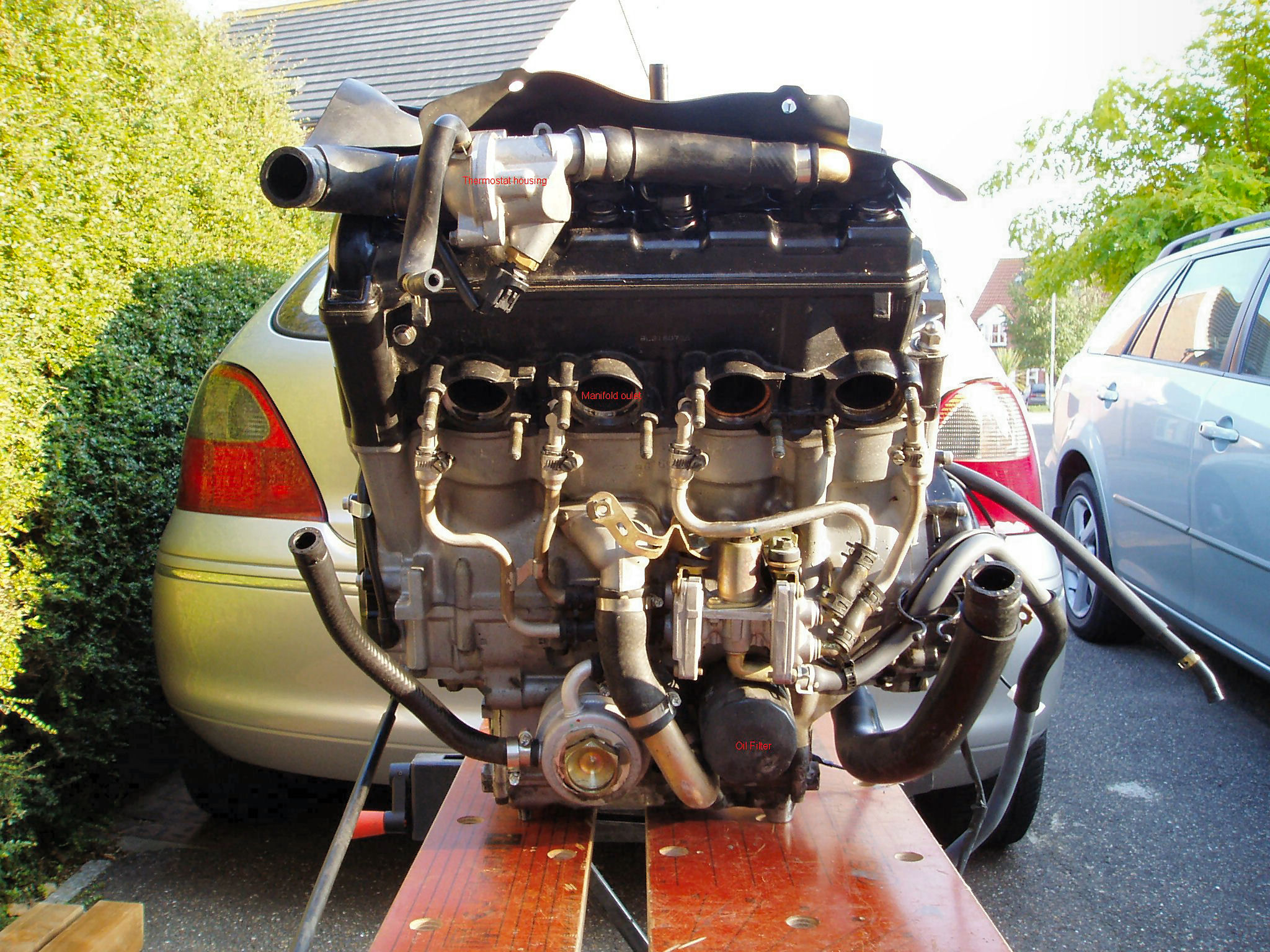 The left of the engine as it would be in the car. This is the front of the engine as it would be in a bike. The hoses are still attached and match the inlets/outlets on my radiator so at least the cooling system is fairly easy to work out.
