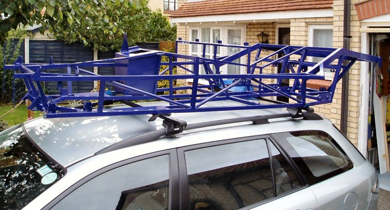 Picked up my chassis today! The weather was on my side so I transported it on roof bars on my Mazda6 estate car, with the panels and other bits in the back. I tie-wrapped the chassis to the roof bars and rack for added security and to keep it in place while I strapped it down. My chosen colour looks fantastic. For some reason it looks much lighter in colour in all my pictures, than it actually looks in real life.