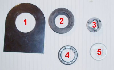 I got an answer to my question about the steering column bits via the Sylva Chat List . [1] is the mounting plate and is bolted to the end of the drivers footwell. [2] is the rubber bush and is pushed through from the back of the car. [4] is the plastic/nylon outer bearing which sits within the rubber bush [2] with the rounded face facing towards the rear of the car. [3] is the inner bearing which goes through [4] from the rear of car.