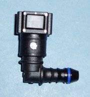 If you remove the safety catch on the engine end and sneeze the grey release buttons on the connector, this plastic pipe comes off to reveal a metal inlet pipe (a bit blurry in this photo). You could connect the rubber fuel pipe to this as it has a convenient beading on it but, it points down at an inconvenient angle.