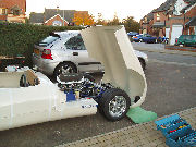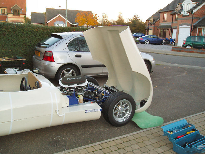 This is the most common way to proceed on a road car. The main tub is bonded and rivetted to the chassis and bonded to the boot floor using fibreglass. This is the quickest and most waterproof approach. The side pods are fixed to the main tub and chassis using rivnuts. The bonnet bolts to the hinges and is held down by some fixings along the back edge.