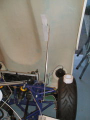 Fitted the bonnet support. I've used Araldite to fix a metal bracket to the inside of the bonnet. The tape shown in the picture is holding it in place while it cures. I will add some fibreglass matting to spread the load wider later. The bonnet will be 'lined' with a protective paint later. A rubber grommet keeps the stay in place. Had to be careful that the front wheel doesn't foul this when stowed and the steering is on full lock.