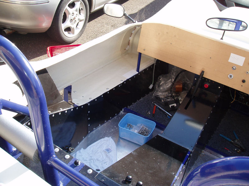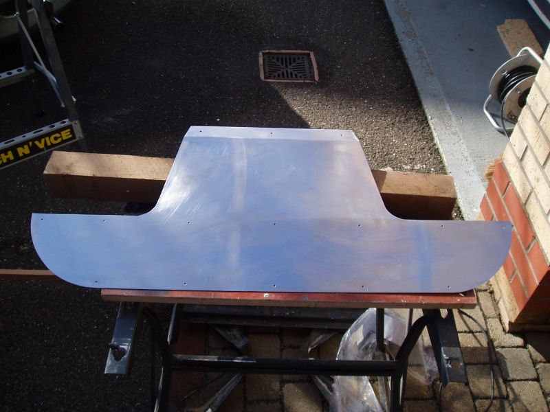 The access cover itself is 1000 x 150mm but this panel extends by a further 250mm to go under the car and fix to the chassis. There are two fold lines in the panel. It will be powder coated or painted black. It covers up the access holes I've drilled, stops the lower edge of the bodywork flexing about and also keeps the back of the main tub aligned.