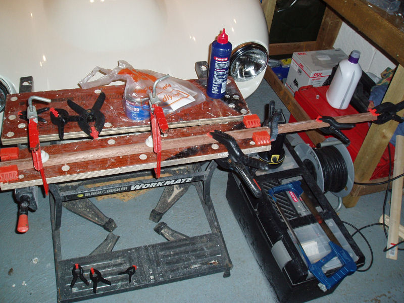 Plan B is to form a rounded base to the dash by using a 15mm radius, hardwood quarter circle moulding from the local DIY store. I glued two half lengths together to form a 120cm long length of semi-circle. This will be painted black and aligned with the front edge of the dash. It's going to be held in place by brackets underneath the dash. It needs to be cut to go either side of the centre console.