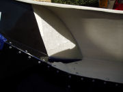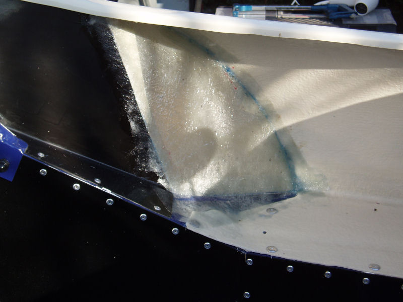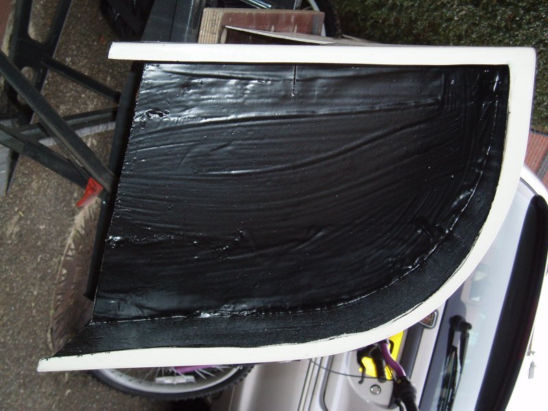 I used some 60mm strips of GRP matting to bond the main tub to the sides of the boot floor. I put a spacer in between the floor sides and the tub overhang first, to give a tidier finish. This is a horrible job as fibreglass matting won't flex into the corners until it is soaked in resin. I got through a lot of disposable latex gloves.