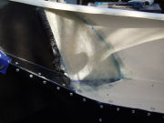 Bonded and riveted the main tub in place. Made sure there were no gaps along the front edge and down the sides of the scuttle to let water in. Put rivets in along the front edge and also along the chassis side rails, inside the car.