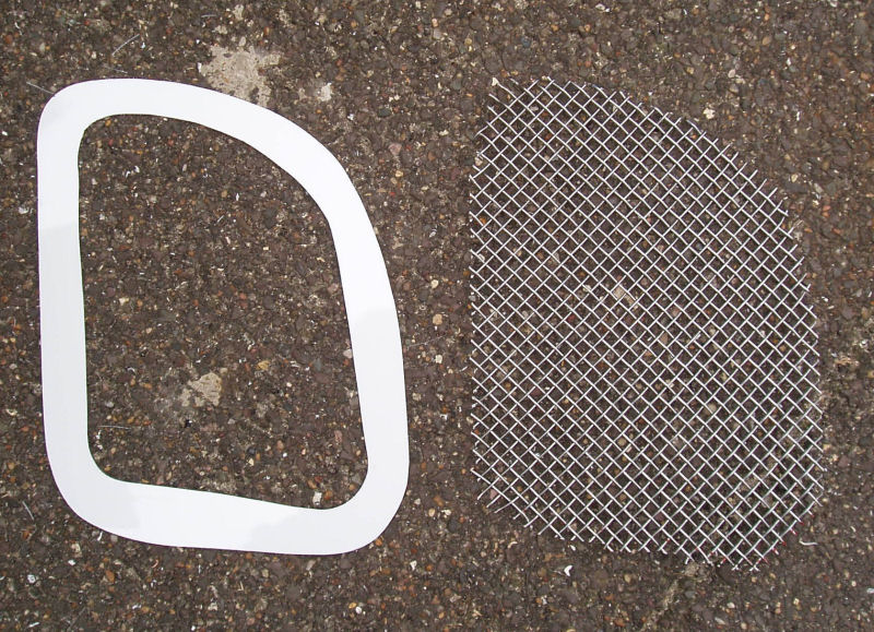 Cut a template and used this to cut out the front face. It is very thin fibre glass so some of it could be cut with scissors. I tidied it up with a rotary file. As it is so thin, I'm going to use a shaped plate to clamp the mesh in place.