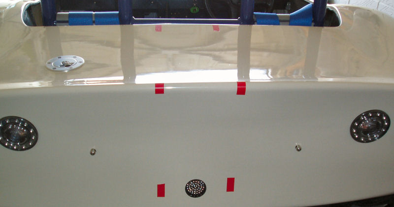 Replaced the SVA fog light with a recessed LED foglight. Needed to add a 22ohm resistor in-line as it is a 9.6V lamp. The red tape is to help align the blue vinyl stripe. This will go over the foglight and I will then cut through to reveal it.