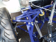 The front suspension features inboard springs and dampers with a rocker arm arrangement. The rocker pivot is designed to support adjustment of the kingpin angle by using washers at each end of the pivot tube. For the SVA test these washer are put at the front end of the rocker pivot tube to give a larger kingpin angle and thus improve the self-centering action of the steering. The downside of this is that this makes the steering feel heavier because in effect, turning the wheels is lifting the front of the car slightly. With the SVA test out of the way, these washers have been moved to the rear end of the rocker pivot tube to lighten the steering and make it more responsive. This does reduce the self-centering action slightly. The grease nipple shown in the picture is to fill the rocker with grease and to stop water getting in and causing corrosion. If the rocker doesn't rotate freely, it places tremendous forces on the chassis mounts and will break them.
