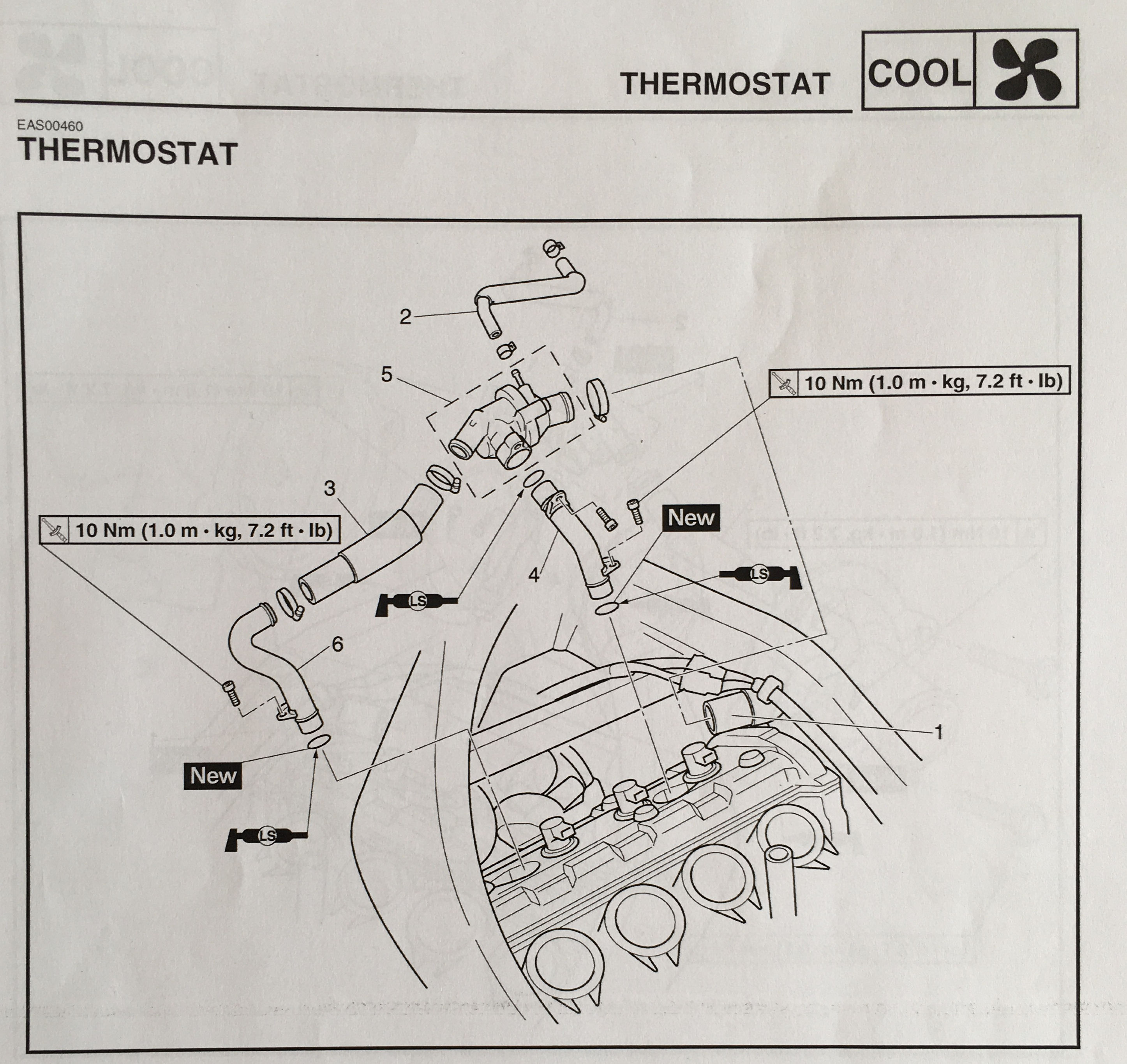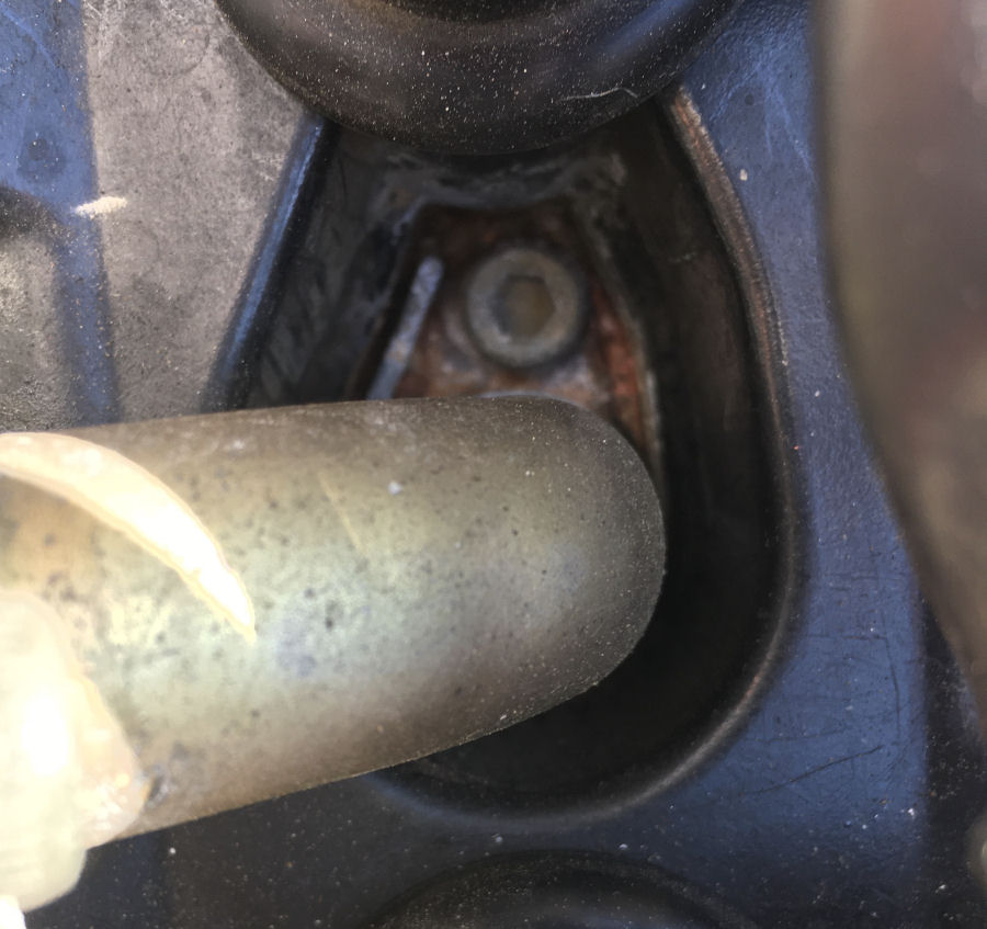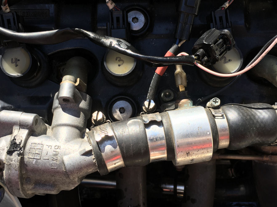 The pipework has been cleaned up and I've painted above the O-ring too. There is a 3rd O-ring on the pipe connected to the thermostat housing and was also be replaced. Cleaning up the engine side is harder as you need to block the hole, to stop all the dirt falling in. It's all now back together and torqued up.