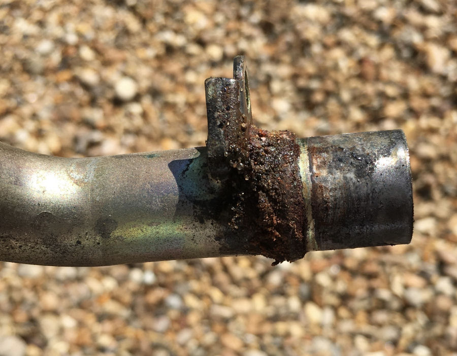 The parts have turned up, so I had a look at the thermostat housing. There are two pipes that are bolted to the top of the head and it looks like there is some corrosion where they enter. My guess is the rubber O-rings have given up.